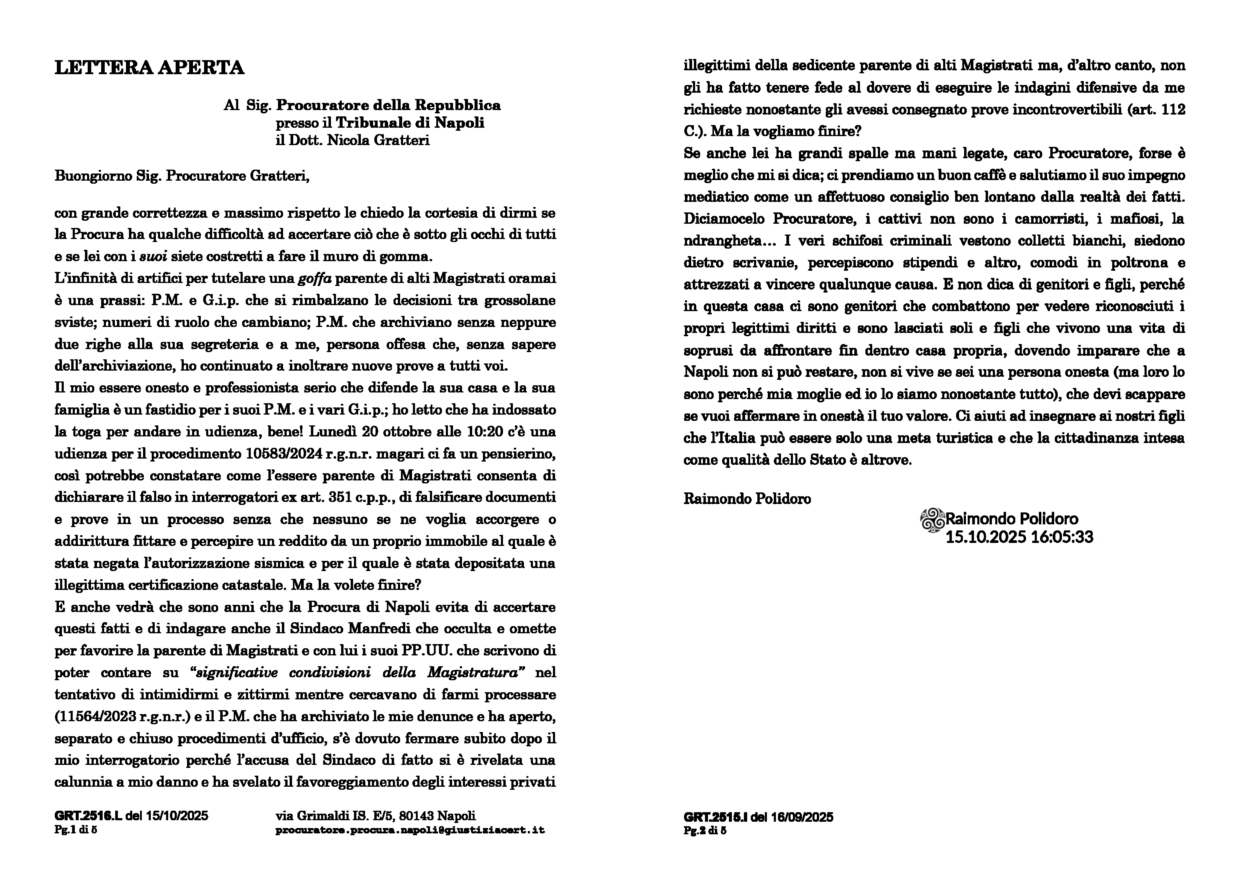 E anche vedrà che sono anni che la Procura di Napoli evita di accertare questi fatti e di indagare anche il Sindaco Manfredi che occulta e omette per favorire la parente di Magistrati e con lui i suoi PP.UU. che scrivono di poter contare su “significative condivisioni della Magistratura” nel tentativo di intimidirmi e zittirmi mentre cercavano di farmi processare (11564/2023 r.g.n.r.) e il P.M. che ha archiviato le mie denunce e ha aperto, separato e chiuso procedimenti d’ufficio, s’è dovuto fermare subito dopo il mio interrogatorio perché l’accusa del Sindaco di fatto si è rivelata una calunnia a mio danno e ha svelato il favoreggiamento degli interessi privati illegittimi della sedicente parente di alti Magistrati ma, d’altro canto, non gli ha fatto tenere fede al dovere di eseguire le indagini difensive da me richieste nonostante gli avessi consegnato prove incontrovertibili (art. 112 C.). Ma la vogliamo finire?